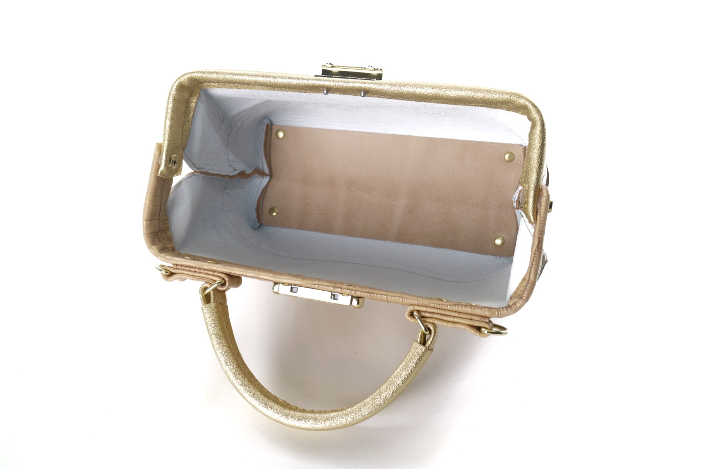 ゴールドがかった上品なベージュレザーにゴールドを合わせた
